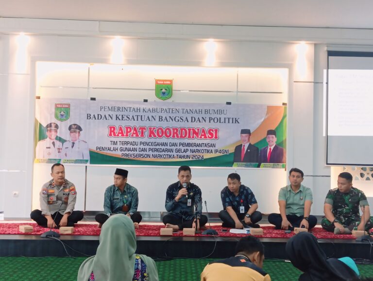 BATULICIN, radio-swarabersujud.com — Pemerintah Kabupaten Tanah Bumbu melalui Badan Kesatuan Bangsa dan Politik (Bakesbangpol) menggelar rapat koordinasi (Rakor) Tim Terpadu Pencegahan dan Pemberantasan Penyalahgunaan dan Peredaran Gelap Narkotika (P4GN) Preksekson Narkotika tahun 2024, di ruang rapat bersujud kantor bupati setempat, Jumat (21/6/2024).
