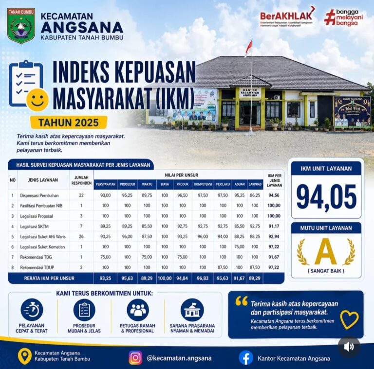 BATULICIN, radio-swarabersujud.com — Kinerja pelayanan publik Kecamatan Angsana, Kabupaten Tanah Bumbu, menunjukkan capaian membanggakan. Berdasarkan hasil survei Indeks Kepuasan Masyarakat (IKM) tahun 2025, nilai yang diperoleh mencapai 94,05 dengan kategori mutu pelayanan A (Sangat Baik).