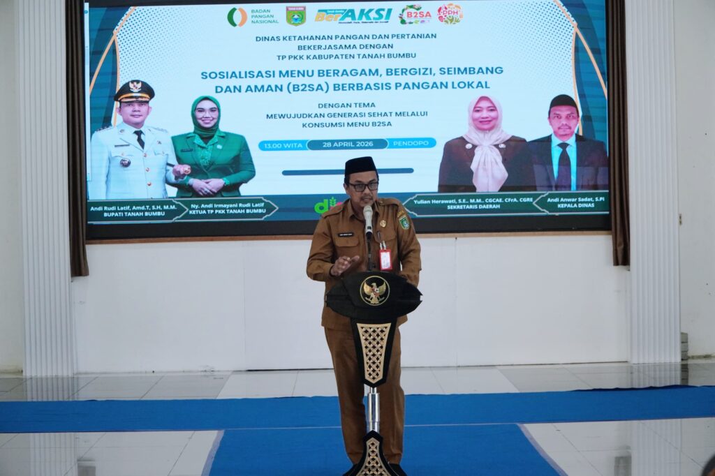 BATULICIN, radio-swarabersujud.com – Pemerintah Kabupaten Tanah Bumbu melalui Dinas Ketahanan Pangan dan Pertanian menggelar kegiatan sosialisasi menu Beragam, Bergizi, Seimbang, dan Aman (B2SA) berbasis pangan lokal, bertempat di Pendopo Kantor Bupati, Selasa (28/4/2026).